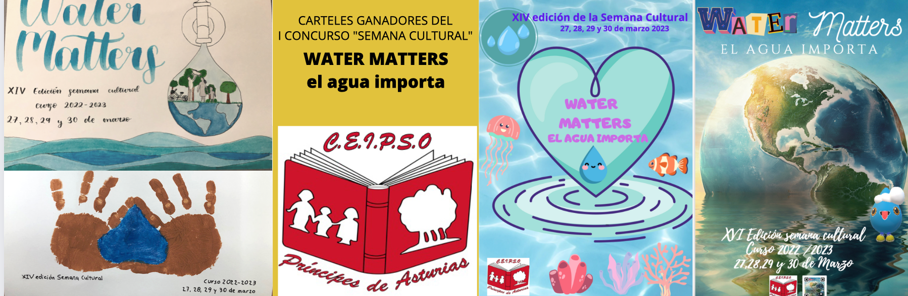 Este año hemos querido promover la creatividad entre nuestros escolares convocando el I Concurso de Carteles "Semana Cultural 2023". Creamos unas bases en las que tenían que basarse los trabajos a concurso. El tema es el mismo que el del Proyecto Anual, "Water Matters, el agua importa". Hubo varias categorías: